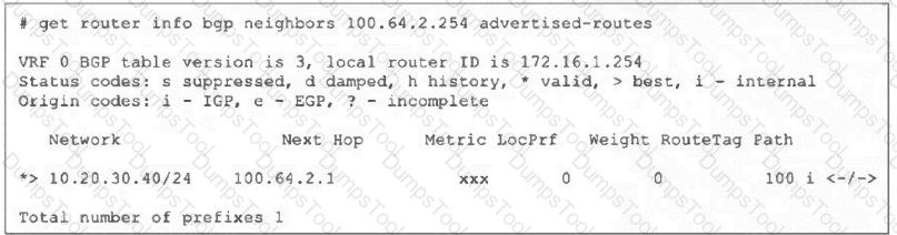 Refer to the exhibit, which shows the output of the command get router info bgp neighbors 100.64.2.254 advertised-routes.