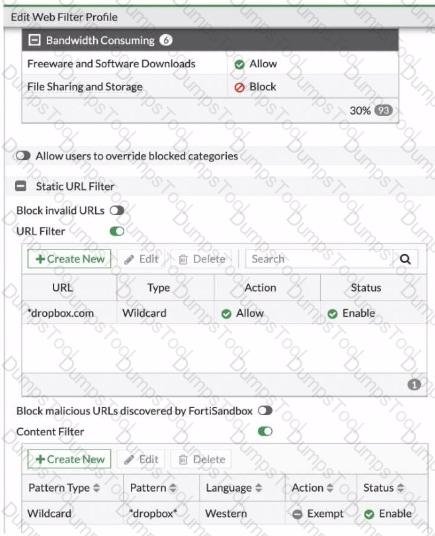 Which action does FortiGate lake if a user attempts to access www. dropbox. com, which is categorized as File Sharing and Storage?