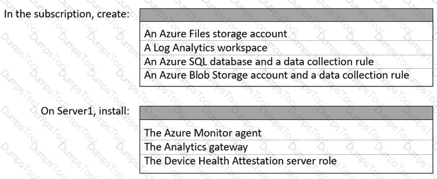 Which resources should you create in the subscription, and what should you install on Server1? To answer, select the appropriate options in the answer area.