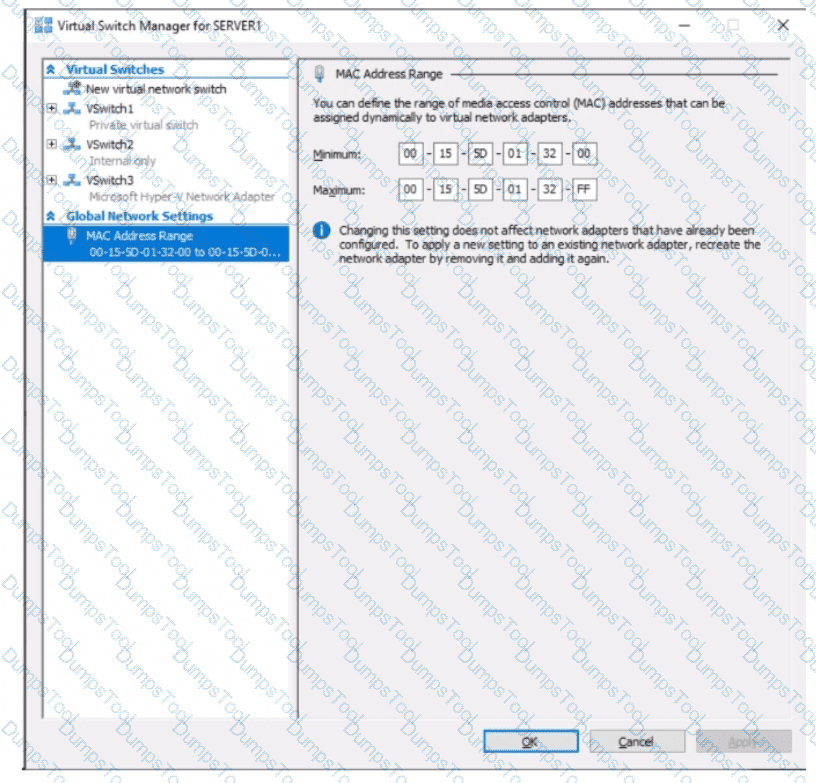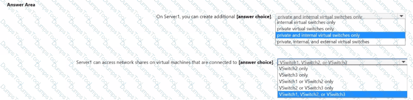 You have a server named Server1 that runs Windows Server. Server1 has a single network interface and the Hyper-V virtual switches shown in the following exhibit.