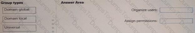 Which type of groups should you use to organize the users and to assign permissions? To answer, drag the appropriate group types to the correct requirements. Each group type may be used once, more than once, or not at all. You may need to drag the split bar between panes or scroll to view content.