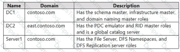 Your network contains an Active Directory Domain Services (AD DS) forest named contoso.com. The forest contains a child domain named east.contoso.com and the servers shown in the following table.