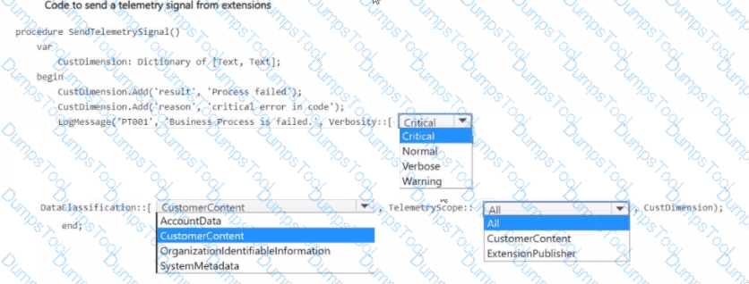 You need to log an error in telemetry when the business process defined in the custom application developed for Contoso, Ltd fails.