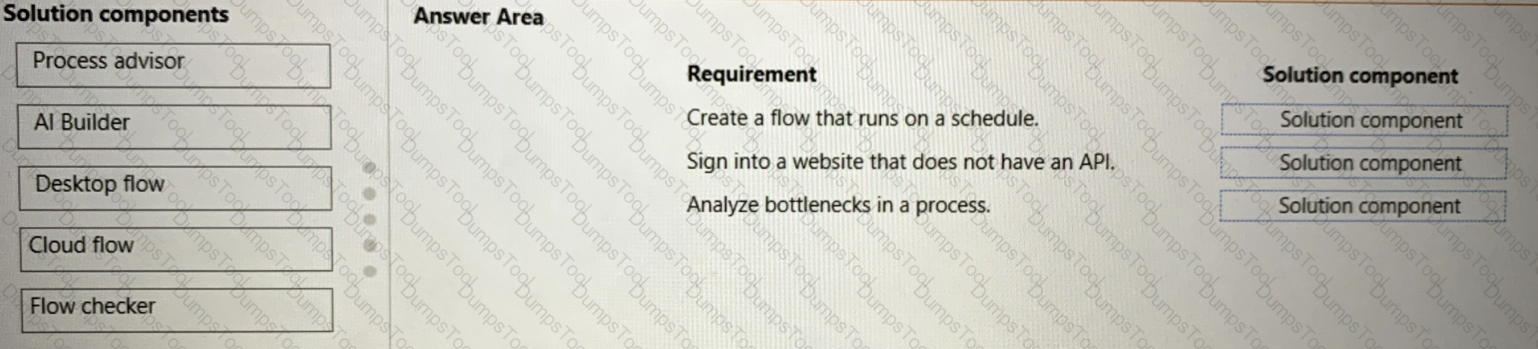 Which solution components should you use? To answer, drag the appropriate solution components to the correct requirements. Each solution component may be used once, more than once, or not at all. You may need to drag the split bar between panes or scroll to view content.