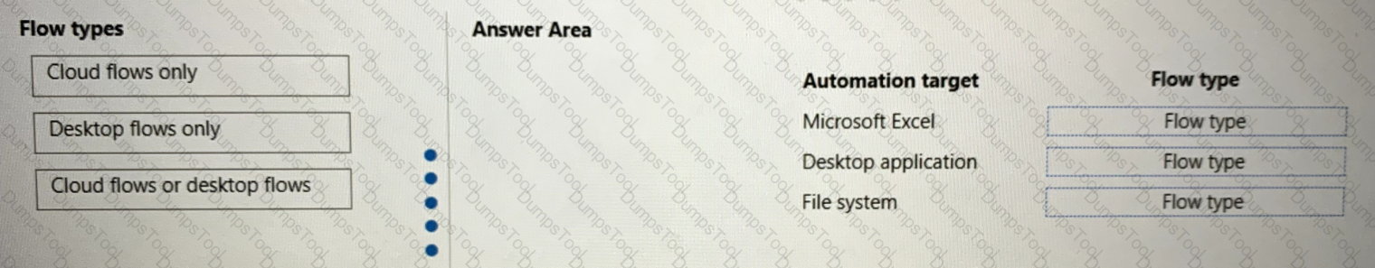 Which flow types should you use? To answer, drag the appropriate flow types to the correct automation targets. Each flow type may be used once, more than once, or not at all. You may need to drag the split bar between panes or scroll to view content.