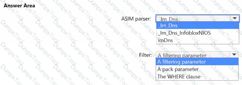 You need to implement the ASIM query for DNS requests. The solution must meet the Microsoft Sentinel requirements. How should you configure the query? To answer, select the appropriate options in the answer area. NOTE: Each correct selection is worth one point.