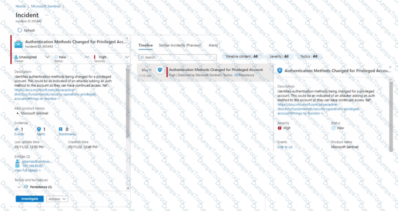 A Microsoft Sentinel incident is generated as shewn in the following exhibit.