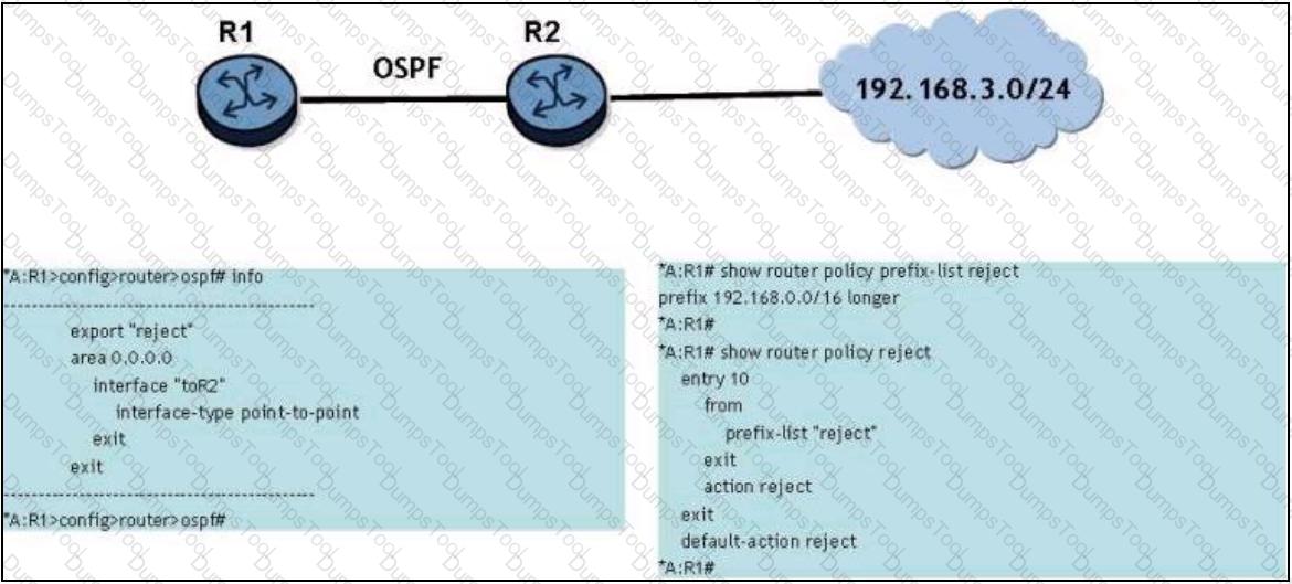 Router R2 advertises the network 192.168.3.0/24 to router R1 via OSPF. A route policy has been constructed to discard the route on router R1; however, it is not working. What is the problem?
