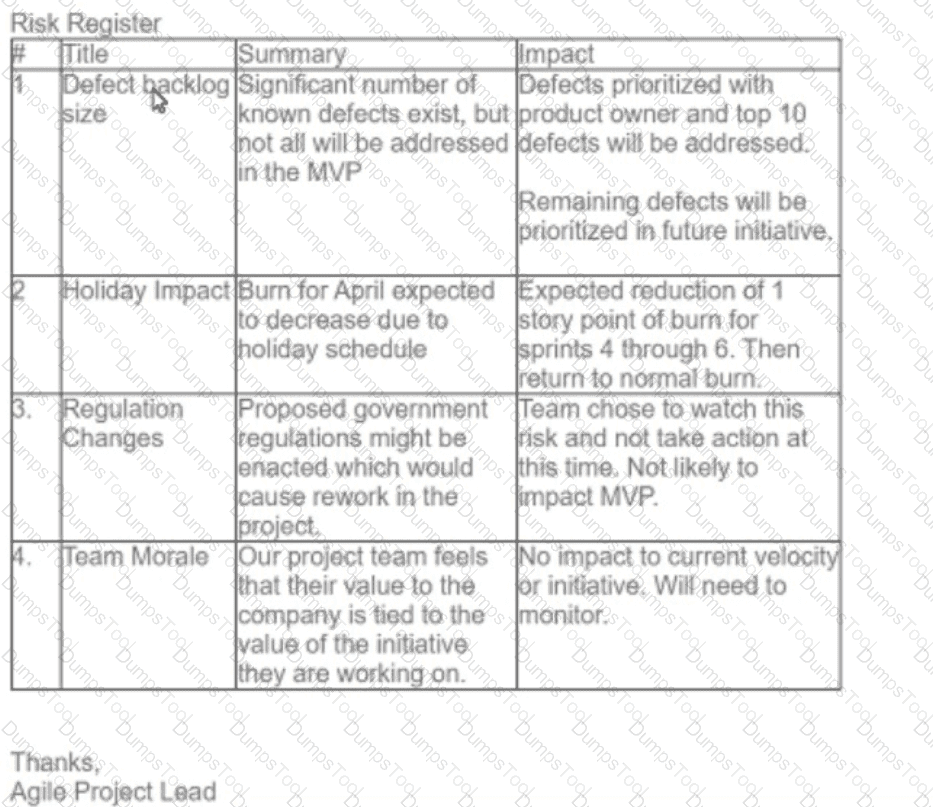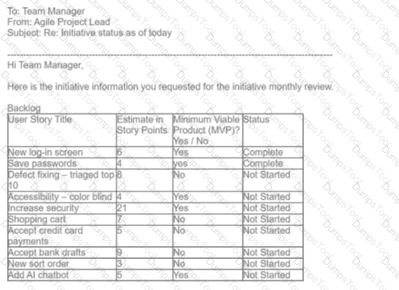 A project team's manager is responsible for delivering a specific initiative for the organization. They are preparing for a monthly meeting where the manager will present on the current state of this initiative. The agile project lead sends the manager the following email with the current initiative status (Refer to the email exhibit).