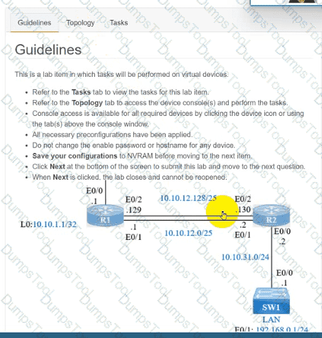 1. Configure R1 and R2 Router IDs using the interface IP addresses from the link that is shared between them.