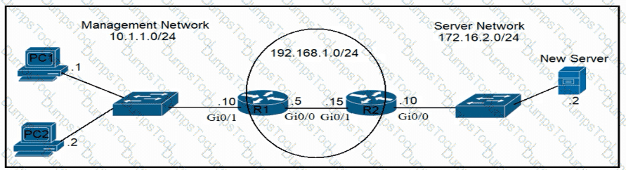 Which route must be configured on R1 so that OSPF routing is used when OSPF is up. but the server is still reachable when OSPF goes down?