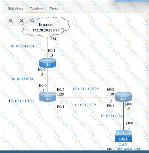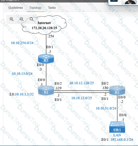IP connectivity and OSPF are preconfigured on all devices where necessary. Do not make any changes to the IP addressing or OSPF. The company policy uses connected interfaces and next hops when configuring static routes except for load balancing or redundancy without floating static. Connectivity must be established between subnet 172.20.20.128/25 on the Internet and the LAN at 192.168.0.0/24 connected to SW1: