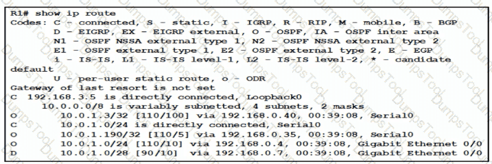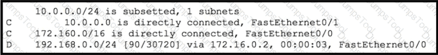 A network engineer executes the show ip route command on router D. What is the next hop to network 192.168 1 0/24 and why?