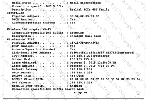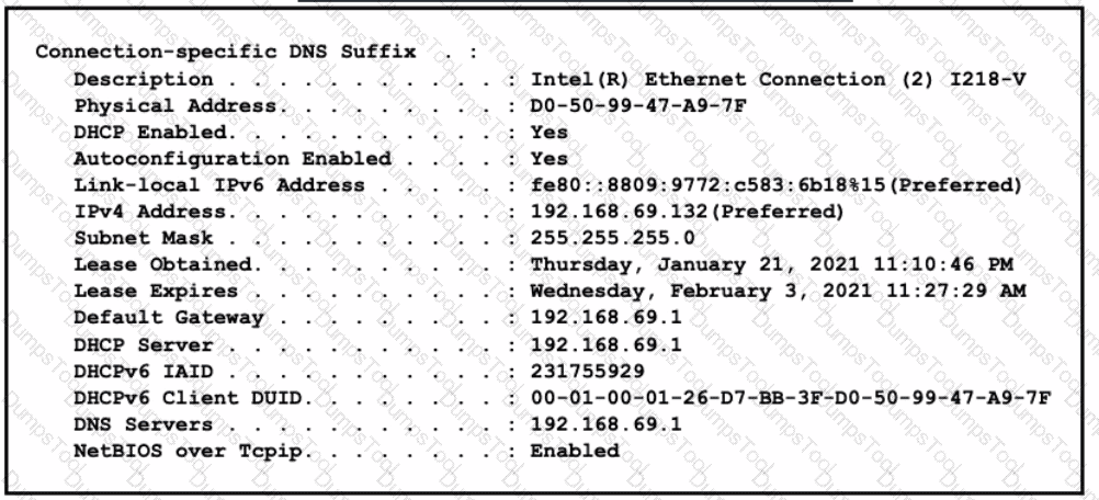 A new DHCP server has been deployed in a corporate environment with lease time set to eight hours. Which CMD command on a Windows-based device allows the engineer to verify the DHCP lease expiration?