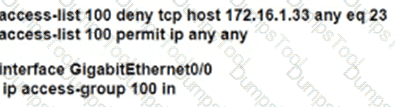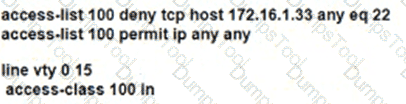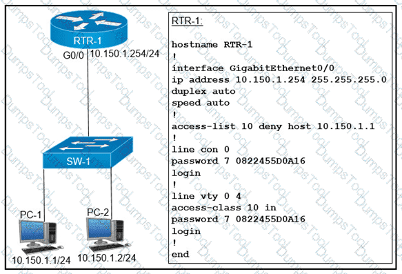 Which configuration for RTR-1 deniess SSH access from PC-1 to any RTR-1 interface and allows all other traffic?