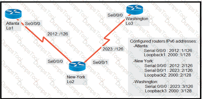 The New York router must be configured so that traffic to 2000::1 is sent primarily via the Atlanta site, with a secondary path via Washington that has an administrative distance of 2. Which two commands must be configured on the New York router? (Choose two.)