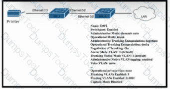 Refer to the exhibit. An administrator must connect SW_1 and the printer to the network. SW_2 requires DTP to be used for the connection to SW_1. The printer is configured as an access port with VLAN 5. Which set of commands completes the connectivity?