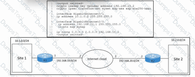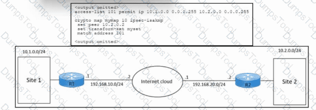 Refer to the exhibit. An engineer must configure an IPsec VPN connection between site 1 and site 2. The indicated configuration was applied to router R1; however, the tunnel fails to come up. Which command must be run on R1 to resolve the issue?