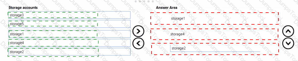 Which three storage accounts should you identify in sequence? To answer, move the appropriate accounts from the list of accounts to the answer area and arrange them in the correct order.