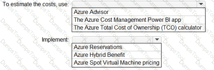 What should you use to estimate the costs, and what should you implement to minimize the costs? To answer, select the appropriate options in the answer area.