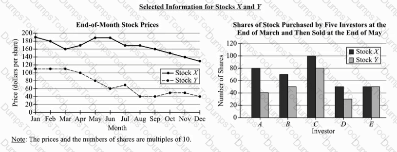 A group of 3 different investors is to be randomly selected from the 5 investors shown. What is the probability that, for at least 2 of the 3 investors selected, the number of shares of Stock X purchased and then sold will be less than 1.5 times the corresponding number for stock Y?