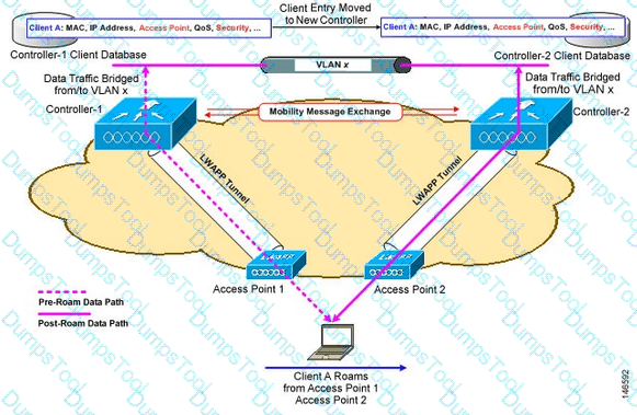 each controller has an interface in the client subnet. Both controllers are running AireOS. Which scenario explains the client roaming behavior?