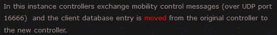 A client roams between two APs that are registered to two different controllers, where