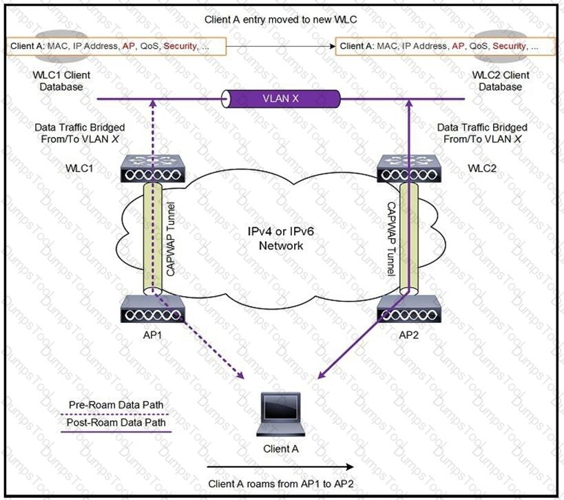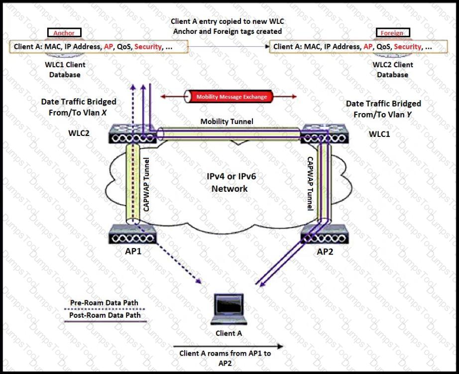 Client A is roaming from AP1 on WLC1 to AP2 on WLC2. The client roams between two APs registered to two different controllers. The WLAN on the two controllers is on a different subnet. Which scenario explains the client's roaming behavior?
