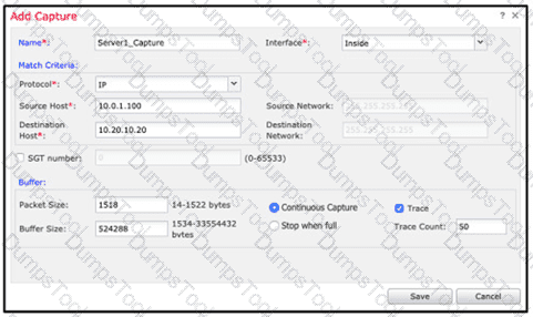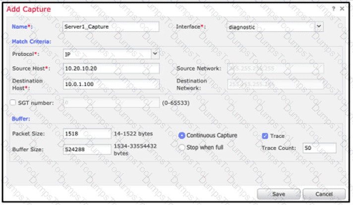 An engineer is troubleshooting a device that cannot connect to a web server. The connection is initiated from the Cisco FTD inside interface and attempting to reach 10.0.1.100 over the non-standard port of 9443 The host the engineer is attempting the connection from is at the IP address of 10.20.10.20. In order to determine what is happening to the packets on the network, the engineer decides to use the FTD packet capture tool Which capture configuration should be used to gather the information needed to troubleshoot this issue?