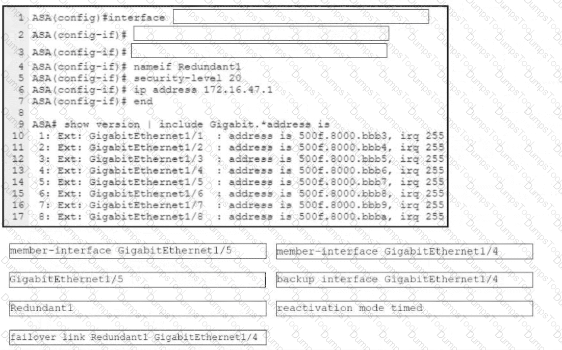 Refer to the exhibit. An engineer must configure a connection on a Cisco ASA Firewall with a Cisco Secure Firewall Services Module to ensure that the secondary interface takes over all the functions of the primary interface if the primary interface fails. Drag and drop the code snippets from the bottom onto the boxes in the CLI commands to configure the failover. Not all options are used.