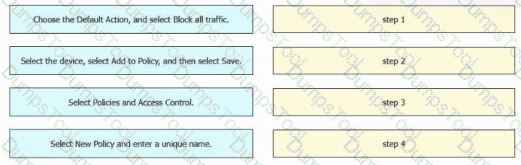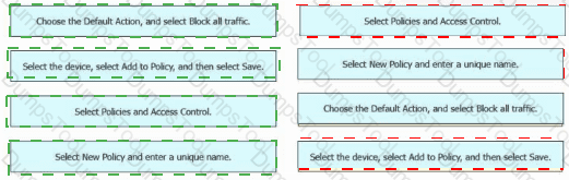 An engineer must create a basic access control policy in the Cisco Secure Firewall Management Center to block all traffic by default. Drag and drop the configuration actions from the left into sequence on the right.