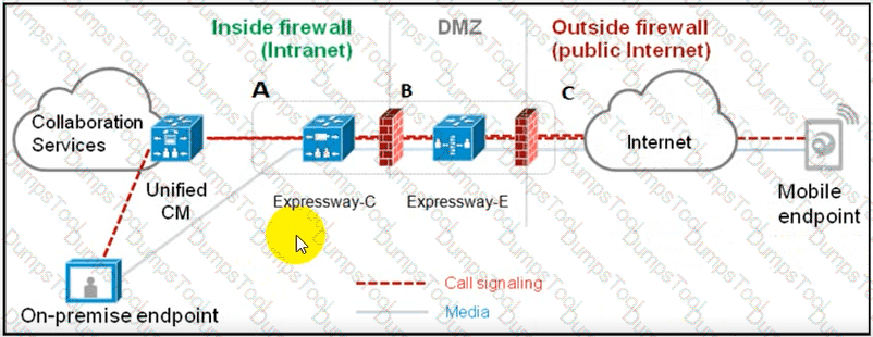 Refer to the exhibit. When making a call to a Mobile and Remote Access client, what are the combinations of protocol on each of the different sections A-B-C?
