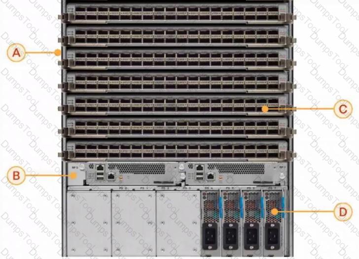 Refer to the exhibit. Drag and drop the names of the field-replaceable units from the left onto the corresponding letters on the image of the Cisco Catalyst 9400 modular switch.