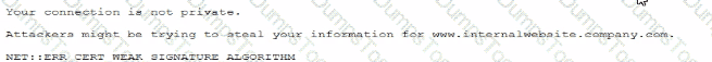 A security analyst received a report that an internal web page is down after a company-wide update to the web browser Given the following error message: