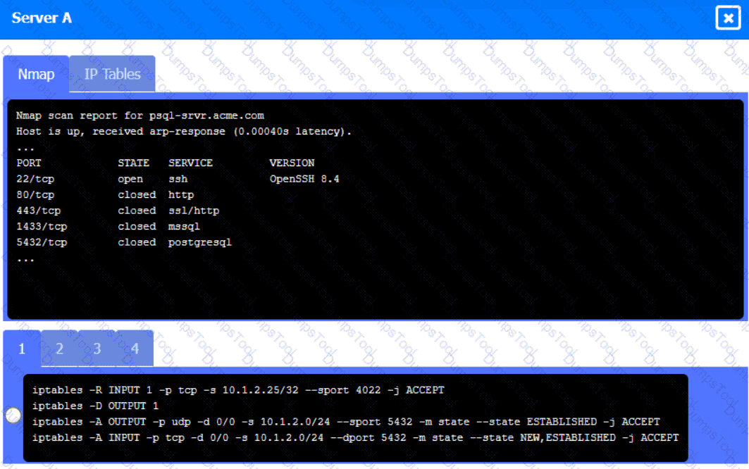Click on Server A to review output data. Select commands in the appropriate tab to remediate connectivity problems to the pOSTGREsql DATABASE VIA ssh