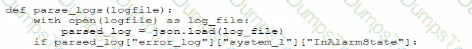 A security administrator needs to automate alerting. The server generates structured log files that need to be parsed to determine whether an alarm has been triggered Given the following code function: