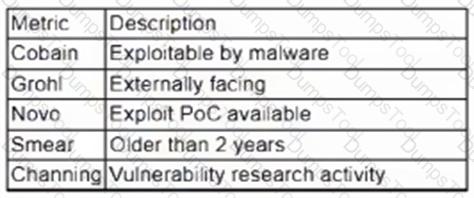 Additionally, the vulnerability management team feels that the metrics Smear and Channing are less important than the others, so these will be lower in priority. Which of the following vulnerabilities should be patched first, given the above third-party scoring system?