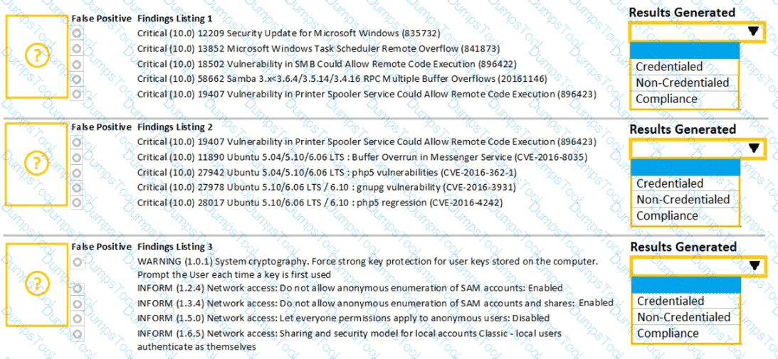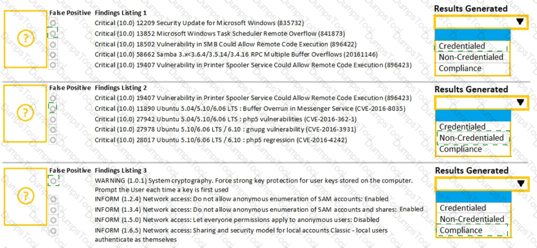 A security analyst performs various types of vulnerability scans. Review the vulnerability scan results to determine the type of scan that was executed and if a false positive occurred for each device.