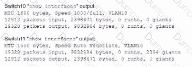 A network technician is troubleshooting network latency and has determined the issue to be occuring two network switches( Switch10 and Switch11). Symptoms reported included poor video performance and slow file copying. Given the following informtion: