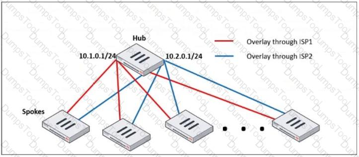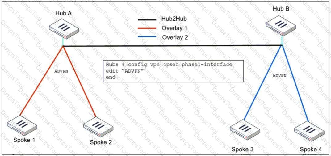 Refer to the exhibit, which shows the ADVPN IPsec interface representing the VPN IPsec phase 1 from Hub A to Spoke 1 and Spoke 2, and from Hub В to Spoke 3 and Spoke 4.