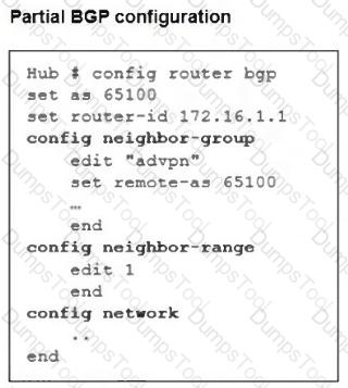 Refer to the exhibit, which shows the ADVPN network topology and partial BGP configuration.