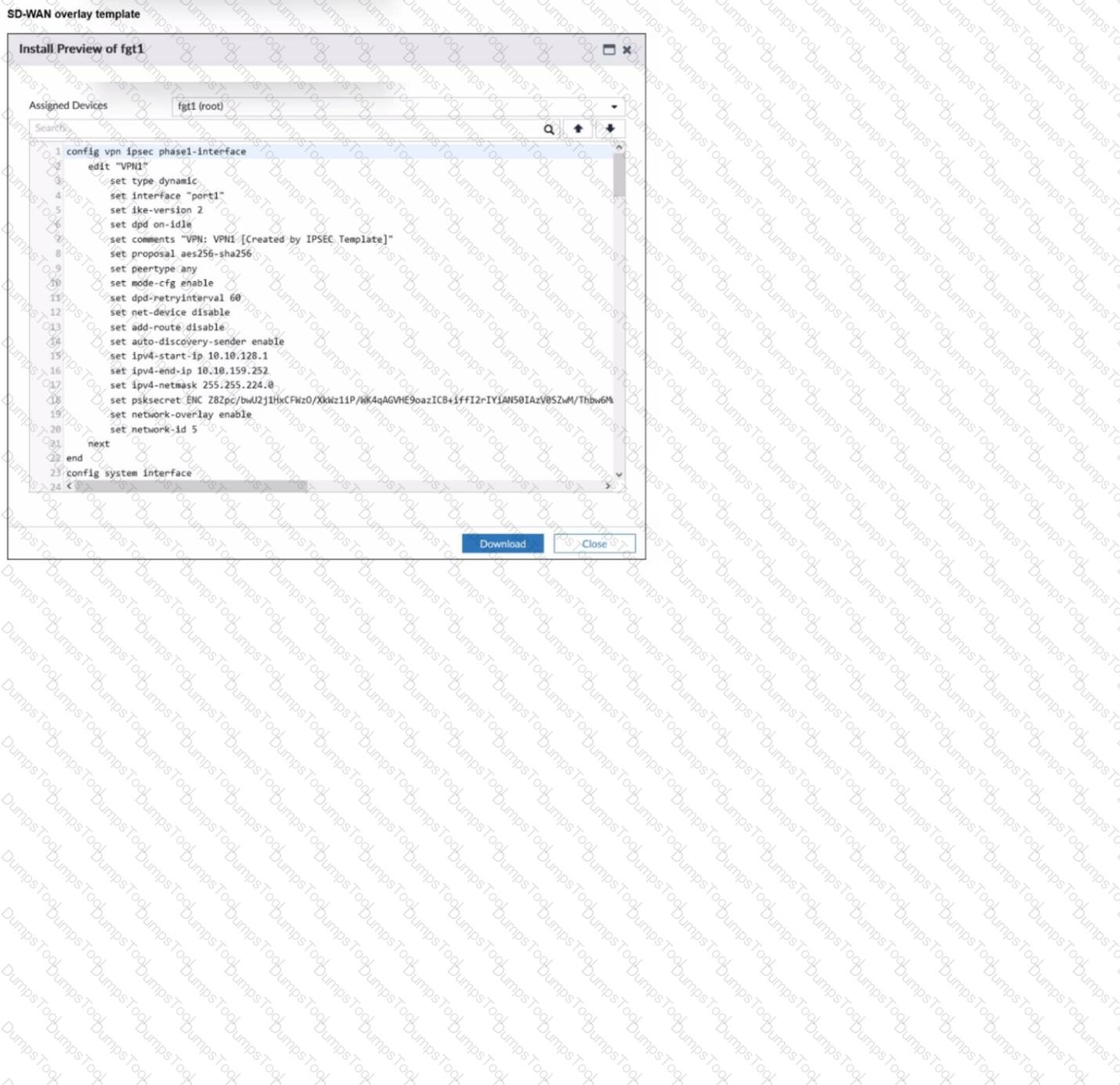 The administrator used the SD-WAN overlay template to prepare an IPsec tunnels configuration for a hub-and-spoke SD-WAN topology. The exhibit shows the FortiManager installation preview for one FortiGate device.