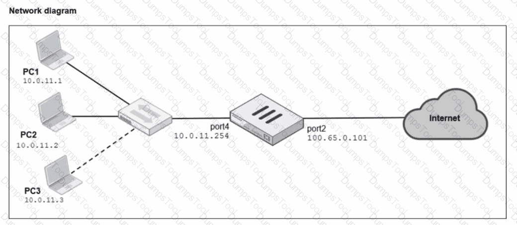Two PCs. PC1 and PC2, are connected behind FortiGate and can access the internet successfully. However, when the administrator adds a third PC to the network (PC3), the PC cannot connect to the internet.
