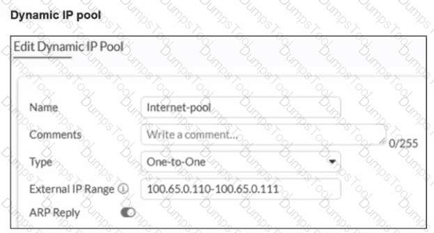 A diagram of a FortiGate device connected to the network, as well as the firewall policy and IP pool configuration on the FortiGate device are shown.