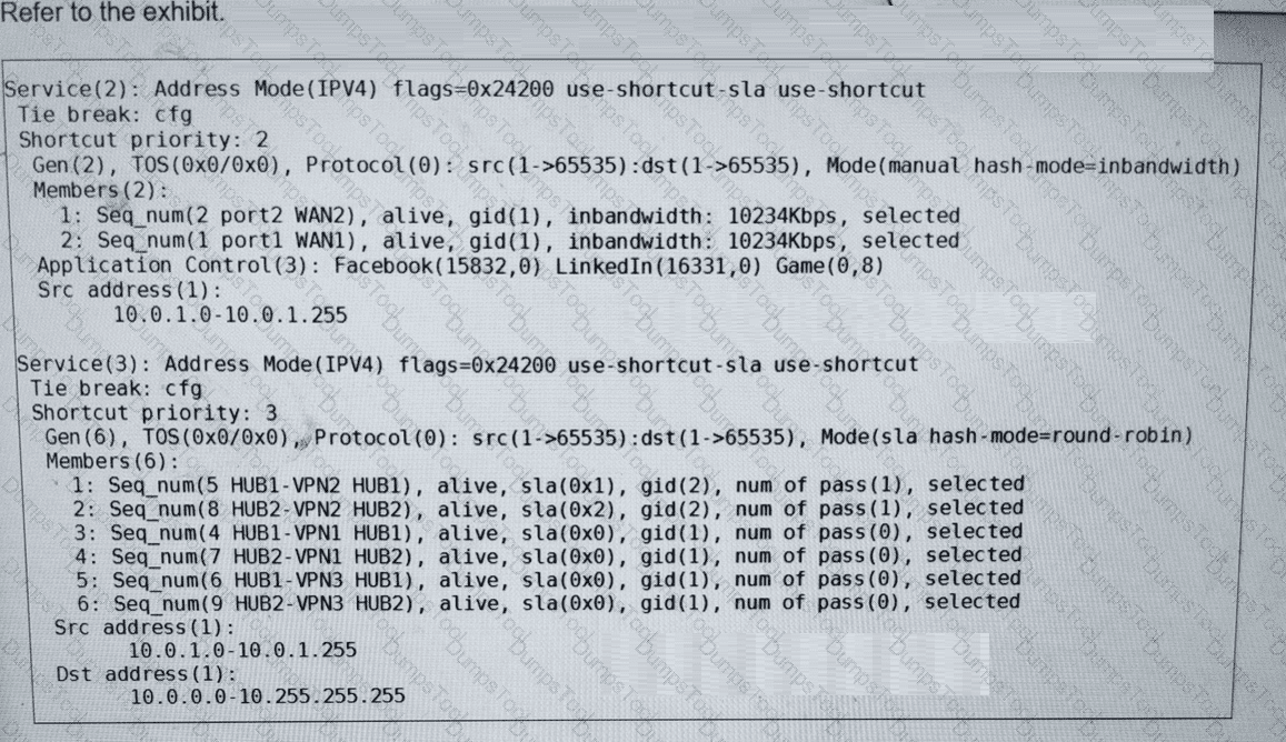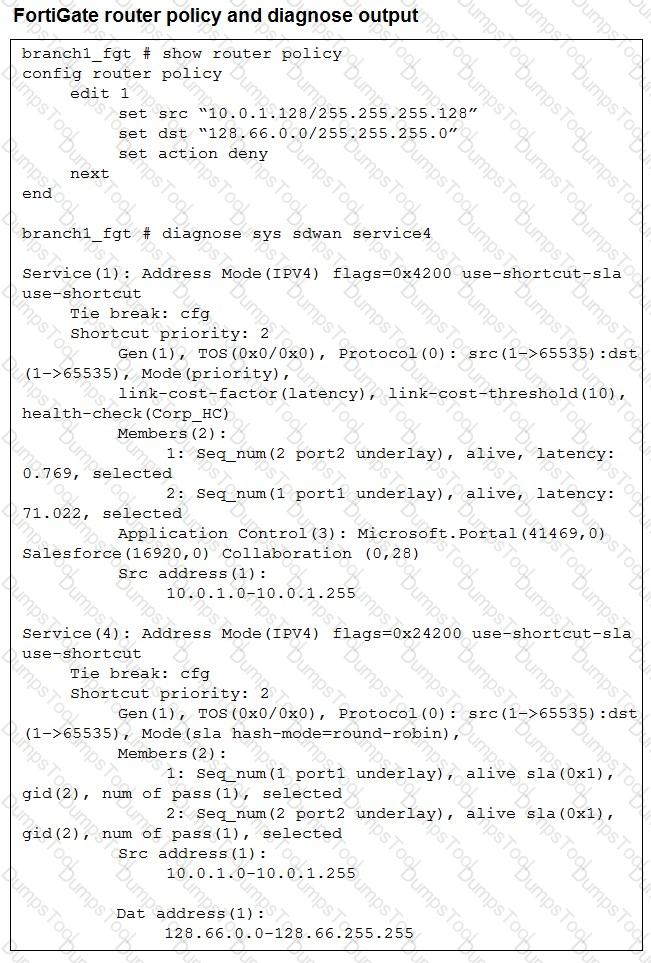 (Refer to the exhibits. You collected the output shown in the exhibits and want to know which interface TCP traffic will flow through from the user device 10.0.1.101 to the corporate file server 10.0.0.125 . All SD-WAN links are stable.