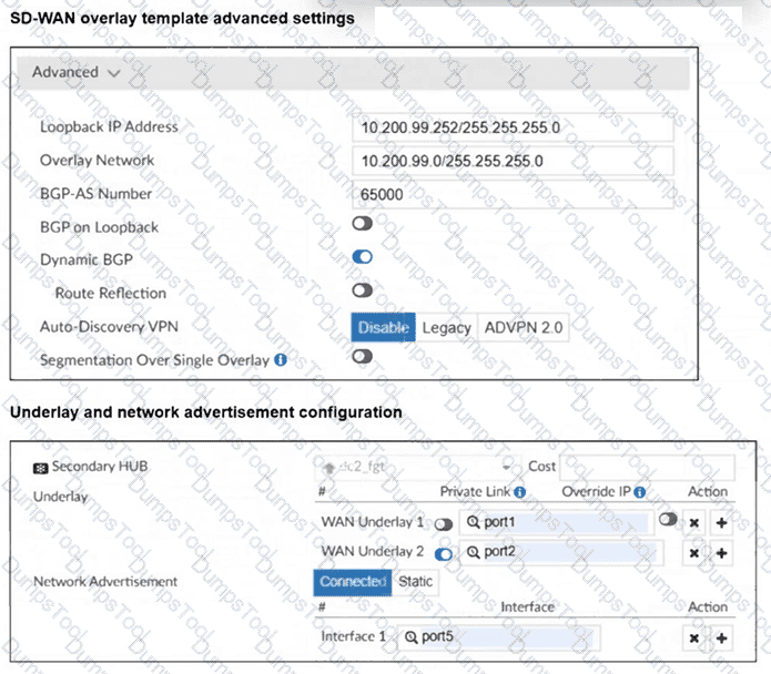 The SD-WAN overlay template advanced settings and the underlay and network advertisement settings are shown. These are the configurations for the secondary hub of a dual-hub SD-WAN topology created with the FortiManager SD-WAN overlay orchestrator.