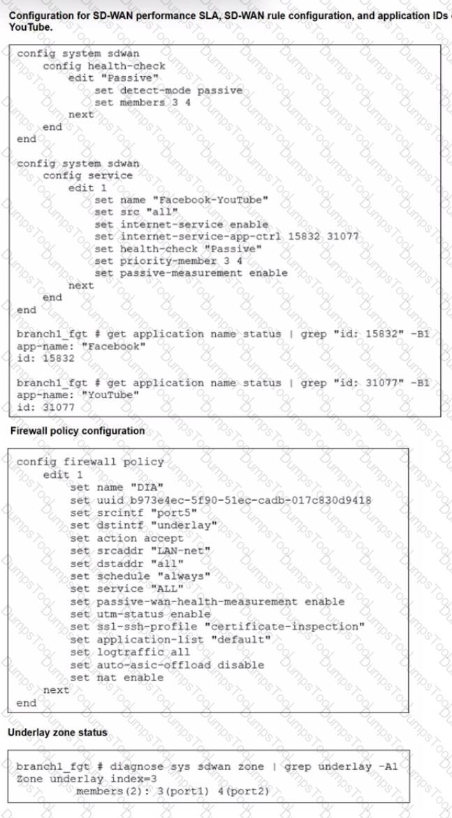 The exhibits show the configuration for SD-WAN performance. SD-WAN rule, the application IDs of Facebook and YouTube along with the firewall policy configuration and the underlay zone status.