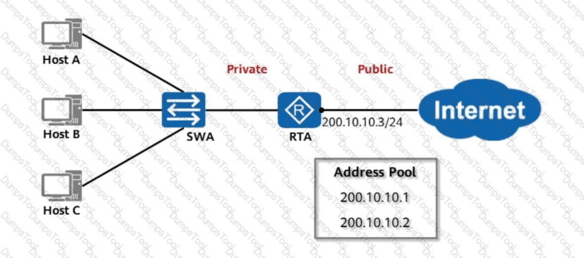 As shown in the figure, RTA uses NAT and has an address pool configured to implement many-to-many non-NAPT address translation, so that hosts on the private network can access the public network. Assume that the address pool has only two public IP addresses, which are translated for Host A and Host B. If Host C wants to access the public network, which of the following statements is true?