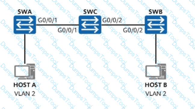On the network shown in the figure, VLAN 2 is created on SWA and SWB, and interfaces connected to hosts are access ports added to VLAN 2. G0/0/1 on SWA and G0/0/2 on SWB are trunk interfaces allowing all VLANs. What additional configuration is needed on SWC to ensure communication between Host A and Host B?