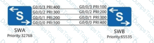 The LACP priority is shown in the figure. Switch A and Switch B adopt link aggregation in LACP mode, all interfaces are added to the link aggregation group (LAG), and the maximum number of active ports is set to 3.